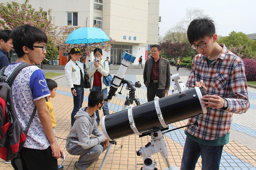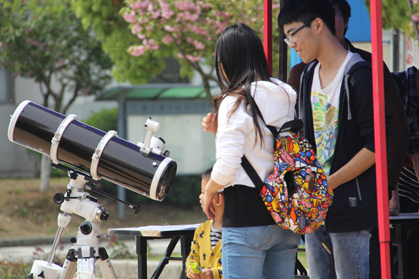 在学院科协的展位前,包含了天文望远镜观测、航天知识大闯关等互动体验项目。“天文观测”项目中,观测者可以通过天文望远镜看到太阳的黑子,引来不断地有人前来体验。同时,“航天知识大闯关”展位前,我们也遇见了对航天有着疯狂的热爱的“大神”,将所有的问题正确的回答出来,赢得了精美的小礼品一份,还与在场同学谈起了他对航天的热爱。