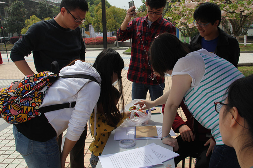 在1515401班级展位前,聚集着一群聚精会神的走迷宫的小伙伴们,有一个特别的初一小男孩引起了大家的注意,他是有母亲和阿姨带来参观大学的,正巧碰上我们正在举办的航天节,先是在科技部的摊位闯过了所有的关卡,获得礼物,还在401班的摊位完成了迷宫游戏,获得了一本精美的笔记本。
