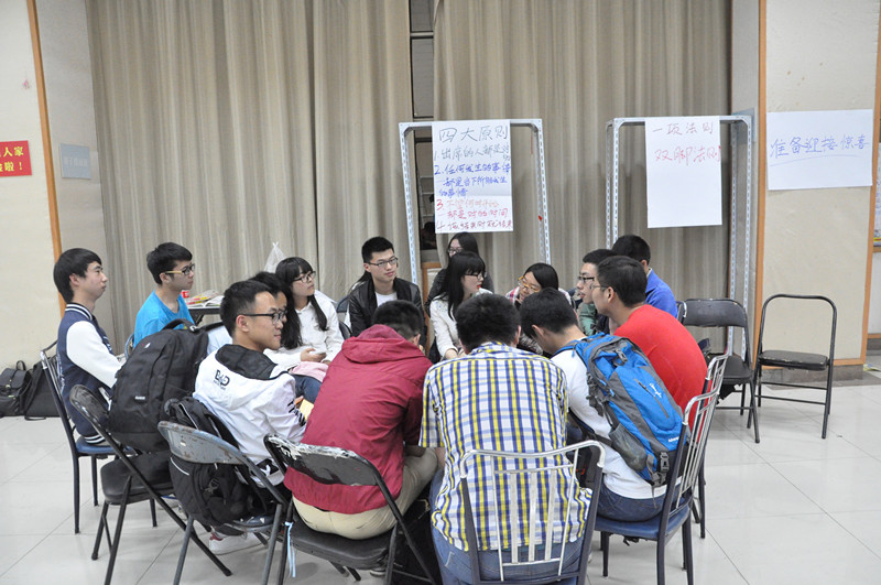 大家发表过看法后,恩派的孟老师进行了总结,并将上一轮关心类似公益时事的同学聚成一个小组,让他们在小组里面继续深度交流。交流过程中,各公益组织的老师们也不断的加入到各小组中,参与交流指导讨论。经过尽一个小时的激烈讨论过后,每组的代表对他们的话题进行了总结展示,并接受老师们和同学们的问题。