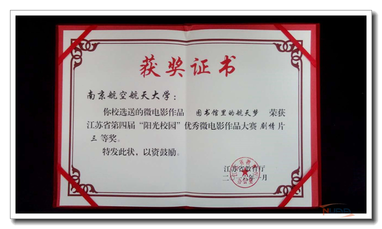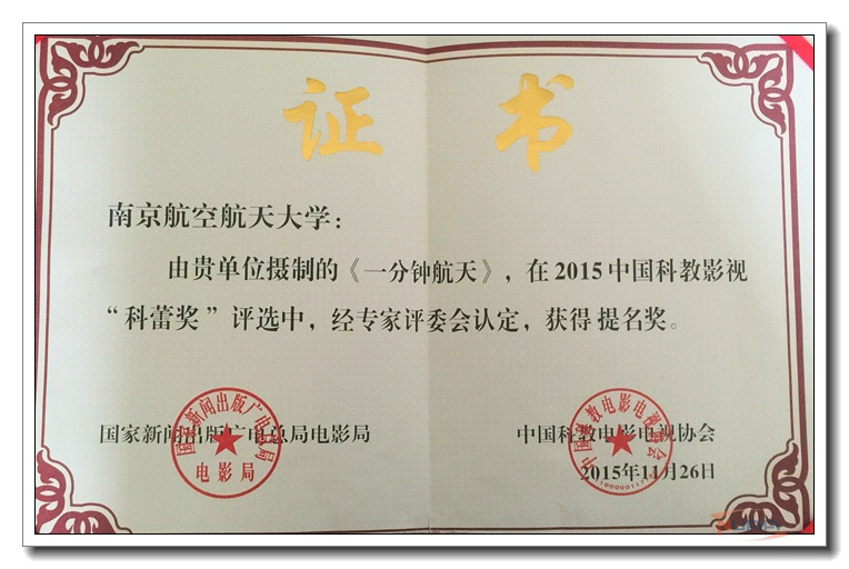 日前,我校多部影像作品获表彰。Betway·必威(西汉姆联)摄制的《一分钟航天》获2015中国科教影视“科蕾奖”提名奖。两个作品获江苏省第四届“阳光校园”优秀微电影作品大赛奖项:航空宇航学院徐亮等同学摄制的《最美的年华留给你》获得剧情类一等奖;艺术学院崔新宇、蔺琳、徐月瑶等同学摄制的《图书馆里的航天梦》获得剧情类三等奖。赵毅获优秀指导教师奖,学校获优秀组织奖。