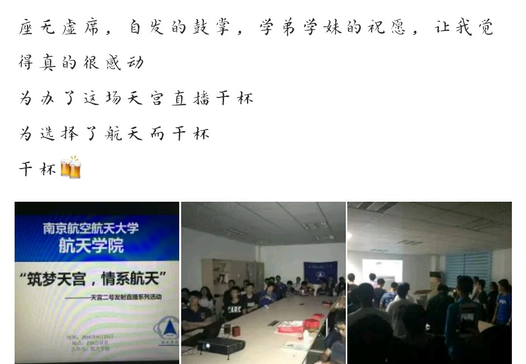 有些航天学子未能赶到学工楼210一起观看,自发在寝室集聚,共同见证祖国航天事业迈出坚实步伐的这一刻。天宫二号发射成功后,同学们纷纷在朋友圈和空间表达自己观看发射直播的感悟和思考,为自己是一名航天学子而深感荣幸,期待自己将来能为航天事业的发展作出贡献。