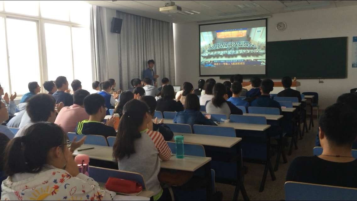从发射前准备、火箭点火升空、到神舟飞船进入预定轨道,每个环节都在向同学们展示着祖国航天事业的魅力。当中央军委副主席范长龙宣布神舟十一号飞船发射成功后,同学们热烈的鼓掌,并通过网络献上自己的对神舟十一号和祖国航天事业的美好祝福。“特别能吃苦,特别能战斗,特别能攻关,特别能奉献”的航天精神激励着一代代航天人,同学们纷纷表示要树立远大的志向,努力学好自己的专业知识。