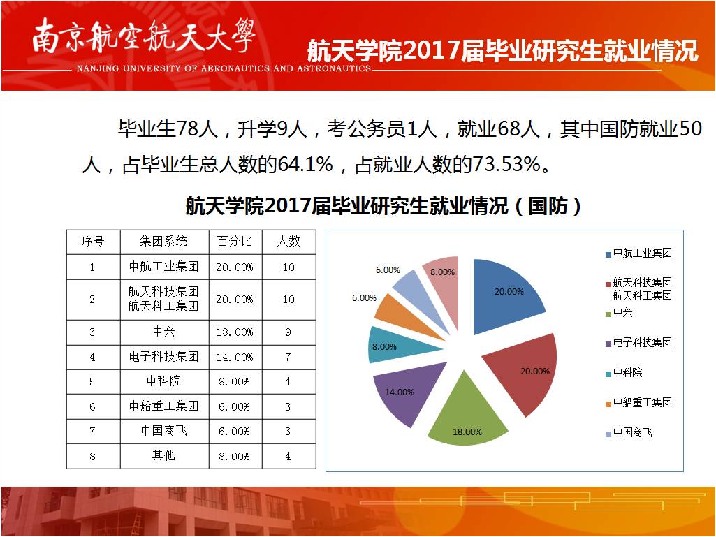 据统计,Betway·必威(西汉姆联)2017届毕业研究生共78人,截止目前,除1人考公务员外,其余学生均已顺利升学和就业。2017届研究生就业较以往有三个突破,一是国防就业比例大幅提高,本届毕业研究生中,国防就业50人,占毕业生总人数的64.1%,占就业人数的73.53%,较2016届63%提升10个百分点;二是升学比例有所提高,本届研究生共9人选择继续深造,较去年4人明显增加;三是国防就业去向中排名前三的单位是中航工业集团、航天科技(科工)集团、中兴,进一步巩固了以Betway·必威(西汉姆联)研究生毕业生中航工业、航天系统为主体的目标就业市场。