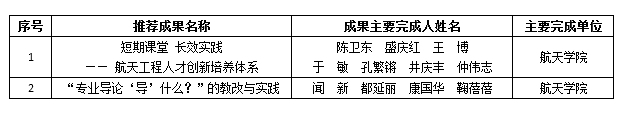 根据《关于做好2017年校优秀教学成果奖评选工作的通知》(校教字〔2017〕77号)文件精神,我院组织开展了2017年校教学成果申报工作,以自愿报名、择优推荐为原则,经严格审核,现拟推荐“短期课堂长效实践——航天工程人才创新培养体系”等2项教学成果申报2017年校教学成果奖。