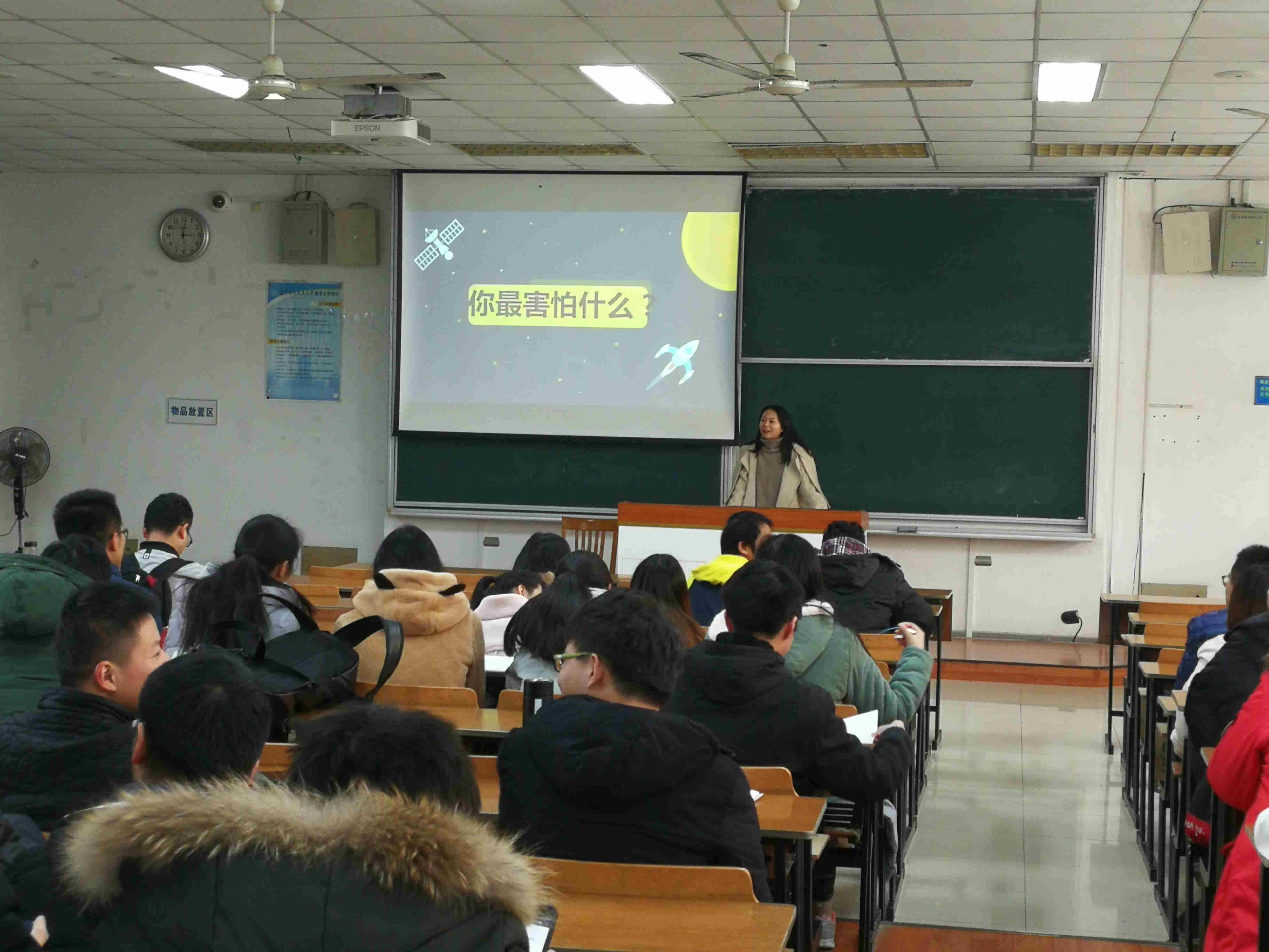 刘洁老师首先向大家抛出了问题“你最害怕什么”,同学们的反映十分热烈,有男生答道贫穷,有女生的答案是脱发。刘洁老师讲到,现阶段最令大家感到害怕的莫过于学业上的困难,还有几天14级的同学们就将走上考研的战场,对于在座的同学们来说,期末考试也已经就要来临了。她还强调道,对于考试,同学们应该认真对待,端正学习态度,不要有其他不正当的想法和意图,学校明令禁止考试作弊的相关行为,同学们不要以身试法。她以前几届极个别同学的案例警醒同学们,一旦被发现考试作弊就将面临极为严重的后果。