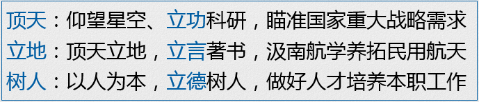 立天地人:顶天,仰望星空、立功科研,瞄准国家重大战略需求;立地,顶天立地,立言著书,汲南航学养拓民用航天;树人,以人为本,立德树人,做好人才培养本职工作。