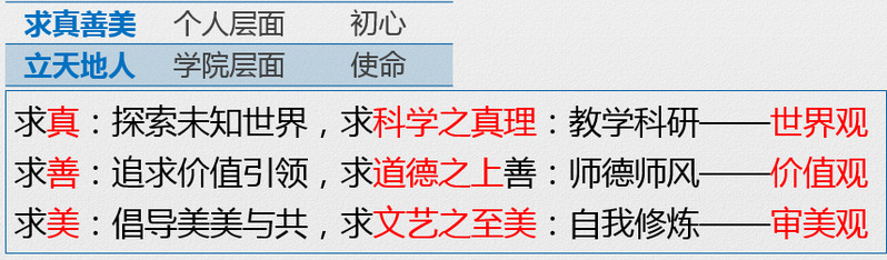 求真善美:探索未知世界,求科学之真理;追求价值引领,求道德之上善;倡导美美与共,求艺术之至美。
