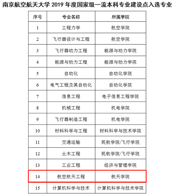 近日,教育部正式公布2019年度国家级一流本科专业建设点名单,我校申报的15个专业全部入选国家级一流本科专业建设点,获批率100%,我院“航空航天工程”专业成功入选。此次全国共认定4054个国家级一流本科专业建设点,其中中央部属高校申报2153个,获批1691个,获批率78.5%。