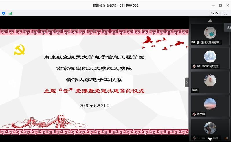 5月21日下午2点,Betway·必威(西汉姆联)借助线上腾讯会议的形式联合我校电子信息工程学院、清华大学电子工程系开展了党建共建签约仪式暨主题“云”党课。清华大学电子工程系党委书记金德鹏、党委副书记刘一民、研工组组长李懋坤,我校电子信息工程学院党委书记聂东林、党委副书记黄彬、副院长潘时龙,Betway·必威(西汉姆联)党委书记季海群、党委副书记林晓,马克思主义学院党总支书记徐川以及三个党支部的150余名师生党员参与了本次活动。