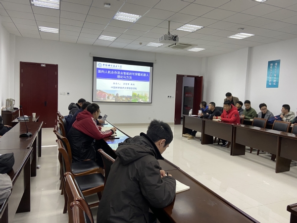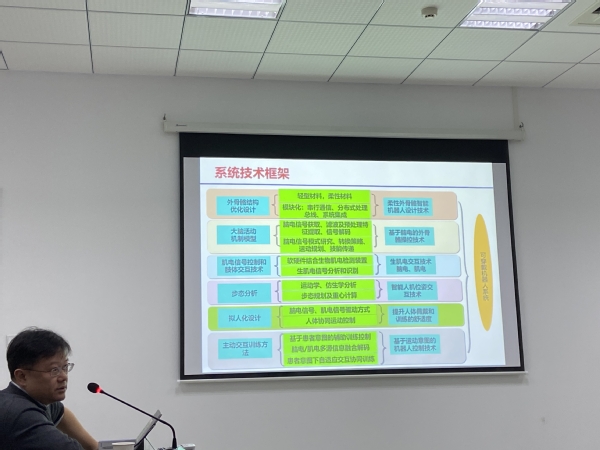 报告中,李老师首先介绍了可穿戴机器人的应用背景和最新进展,讲解了中科大先进技术研究院先进机器人中心在可穿戴上肢双臂机器人、可穿戴下肢机器人、柔性外骨骼机器人、智能下肢义肢、可移动操作机器人、变刚度移动操作机器人等方面的成果内容和关键技术;系统介绍了可穿戴机器人系统设计方案、研究方案,围绕可穿戴机器人在“感、知、融、控”几方面的研究挑战,具体讲解了可穿戴机器人非结构环境主动认知,操作主题的运动意图认知,人机耦合优化控制等方面的研究内容。报告内容丰富、精彩生动,报告结束后,参会的老师及研究生与李教授在人机交互、变刚度控制、柔性结构等方面进行了深入的交流讨论,对相关科研工作具有极大的借鉴作用。