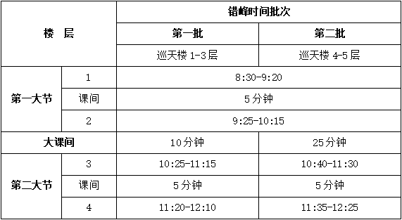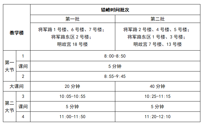 1.本学期继续施行3-4节错峰上下课时间安排,各校区具体上课时间见下表: