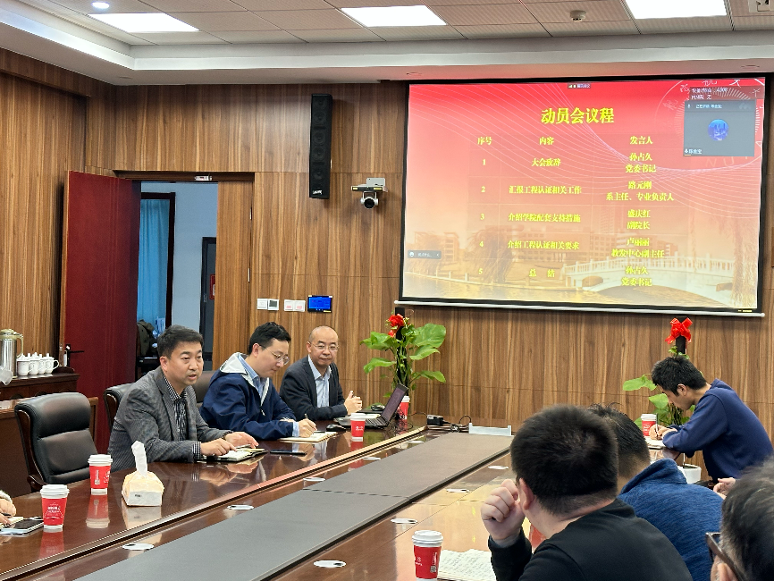 会上,首先由学院党委书记孙占久致辞。孙书记着重强调了工程教育认证工作的必要性,以及工程认证对于专业建设的重要意义,要求各基层教学组织及教师要按照要求改进现有课程设置,需充分调研其他学院和其他学校的成功案例、吸收经验,同时做好顶层设计、明确任务分工。