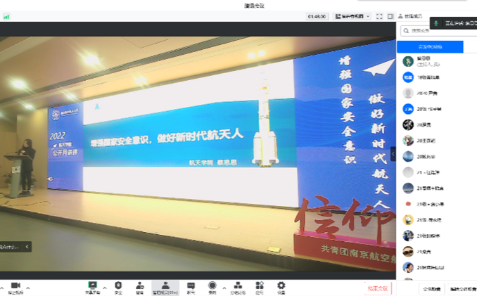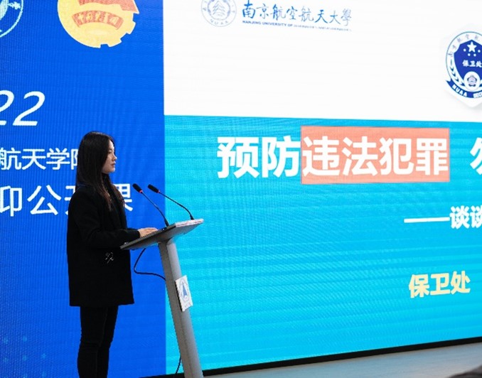 12月3日,由Betway·必威(西汉姆联)团委主办的“增强国家安全意识,做好新时代航天人——信仰公开课”在Betway·必威(西汉姆联)B501报告厅举行。公开课由学院研究生辅导员蔡思思主持,邀请到校保卫处副处长周栋栋,南京江宁开发区派出所派驻高校民警、一级警长娄军来主讲,学院副院长朱旭东、2021级本科生辅导员徐伟证以及学院全体研究生通过线上线下相结合的方式参加。