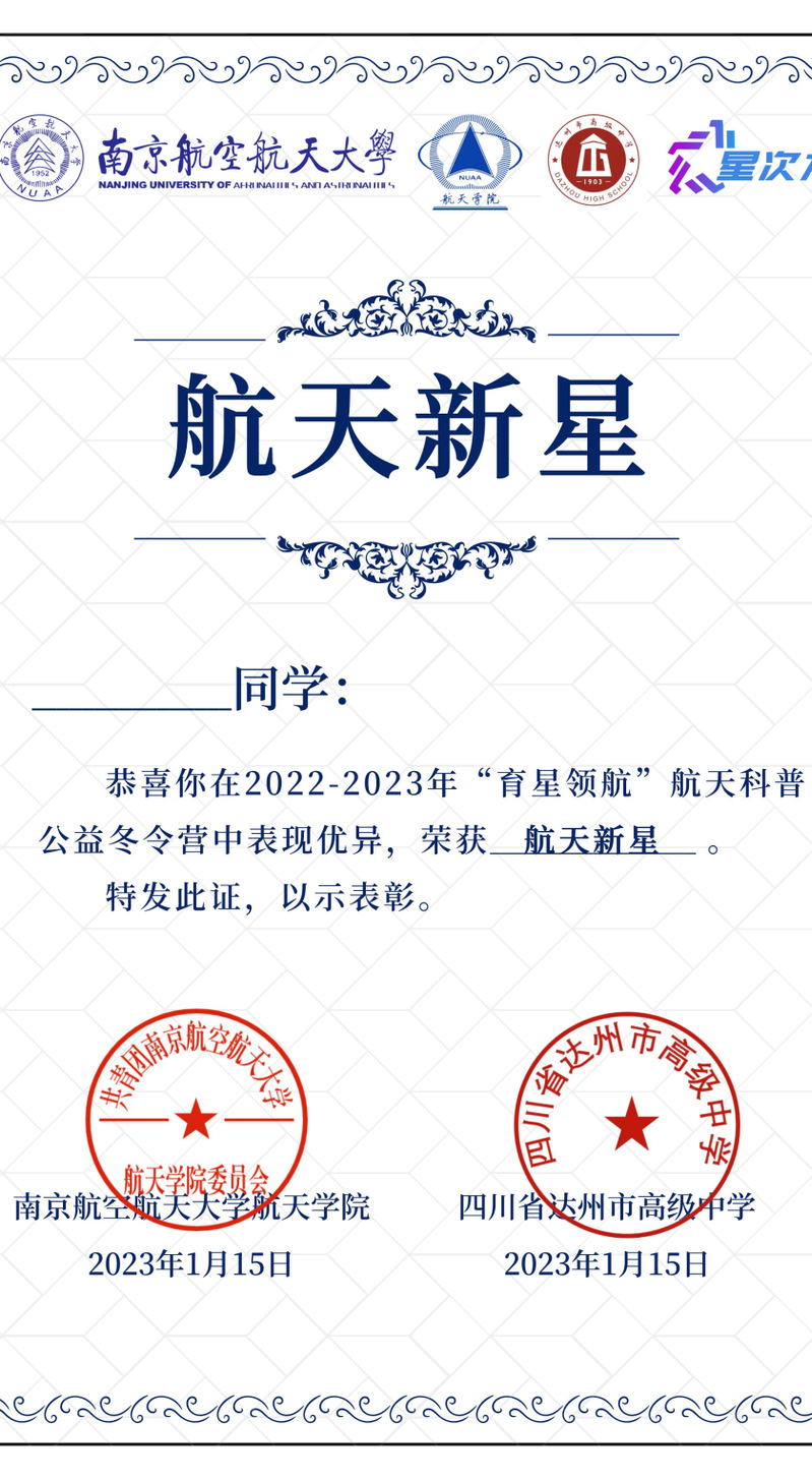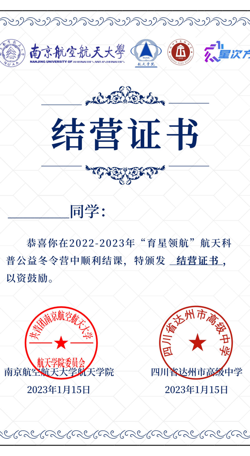 课程结束后我们为在本次过程中表现优异的同学颁发航天新星荣誉证书和结营证书,通过八节系列课程的学习,同学们收获的不仅仅是对宇宙知识的了解,更是对中国航天事业发展的振奋与自豪。当孩子们抬头仰望天空时,无垠的星海将会成为未来所畅享的空间,填满内心对遨游宇宙的幻想。