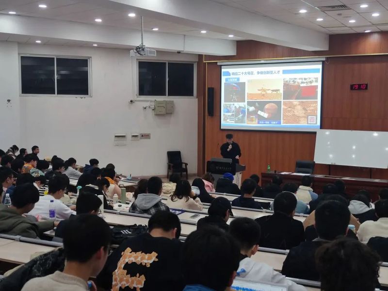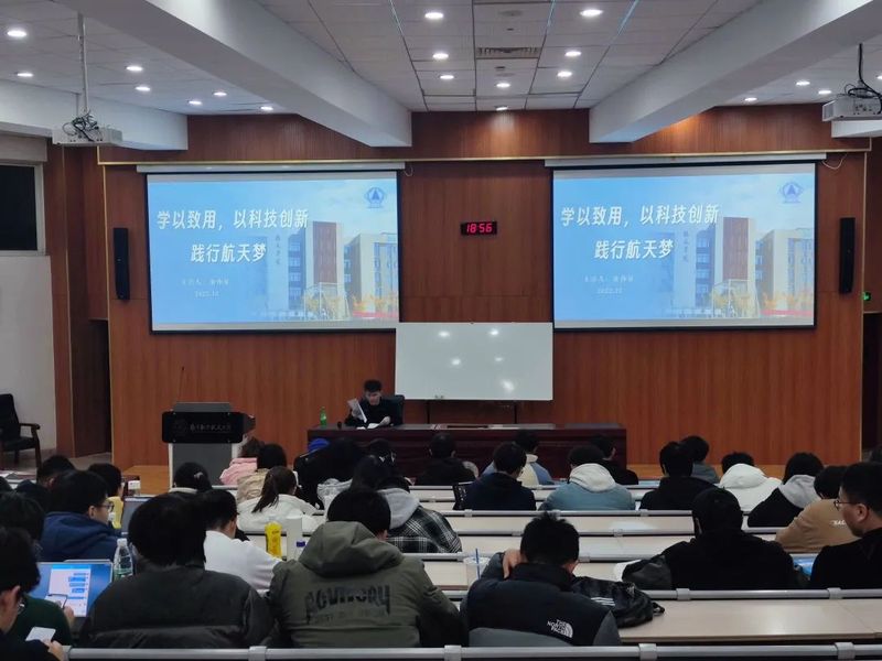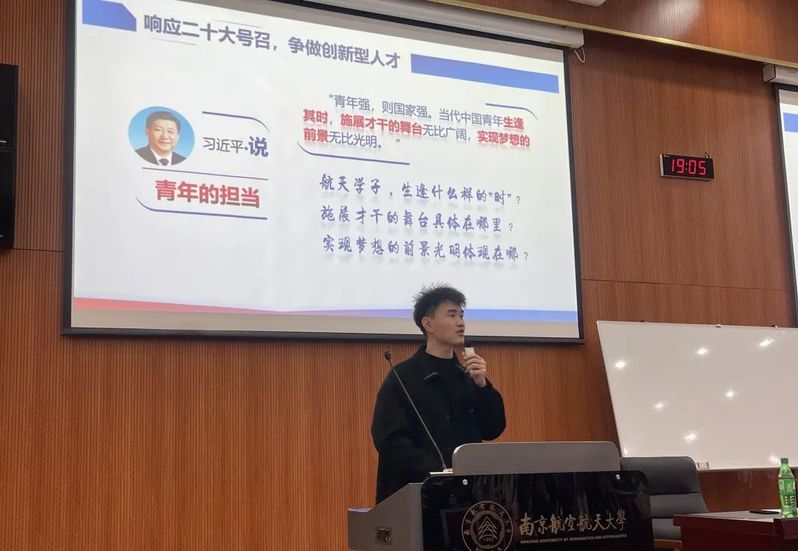 徐伟证带大家一起学习了党的二十大报告中的航天元素,重温载人航天、探月探火、卫星导航和量子通信,一起感悟航天学子施展才华的广阔舞台,由此延伸到我们航天学子的“青年担当”,探讨当代青年该如何做。