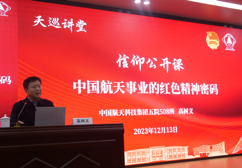 高树义以“中国航天事业的红色精神密码”为题,结合他身边航天人的故事经历和他自己对航天精神的传承践行,从“航天精神谱系的构成”“航天精神的基本内涵”“赓续红色基因,弘扬航天精神”三方面娓娓道来,为大家带来一场励志激昂的讲座。高树义引用毛泽东主席的话“人是要有一点精神的”告诉我们,人生不仅仅是为了满足个人的欲望和享受,更需要有一种精神追求,要为社会做贡献、为他人谋福祉,而我们中国航天在发展过程中就孕育出了很多宝贵的精神。