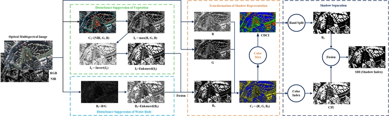 研究表明,尽管物理特征是目标检测与识别最重要的基础,但在动态的成像环境中单一的物理特征无法保证模型的稳健性和适应性。基于对遥感影像阴影及其主要干扰物在不同谱段上电磁辐射差异的分析,构建了基于多物理特征的联合检测模型,以获得更高的准确性、更好的鲁棒性和更广泛的适应性。模型的总体框架如图1所示,主要由四个关键模块构成,分别是植被干扰抑制,水体干扰抑制,阴影表征变换,以及阴影分离。