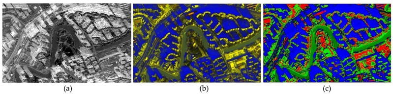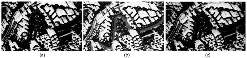 图4. 候选阴影区(a)、纯色指数图像CPI(b)和阴影指数图像SDI(c)