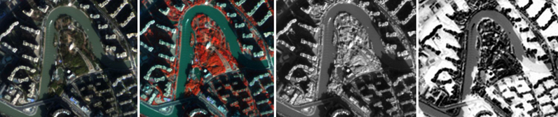 图3. 水体抑制增强后的比值图像(左),阴影多特征增强后的假彩色合成影像(中)和归一色彩差异合成指数图像(右)