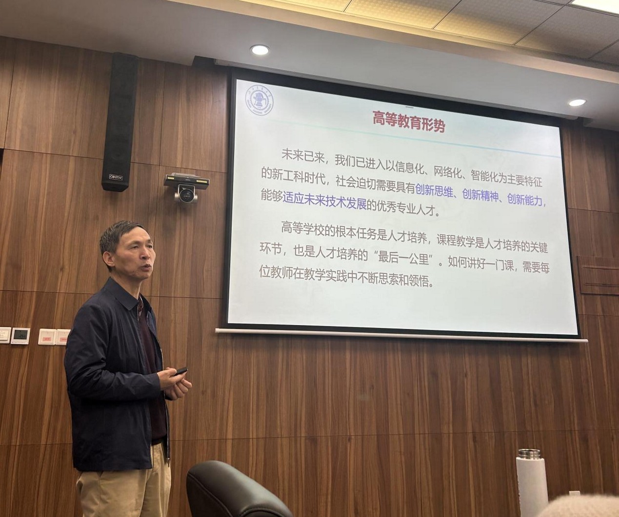 报告结束,现场教师围绕 AI 教学资源建设的路径、课程与教材协同推进的具体方法、新工科背景下电工电子课程内容的优化方向等核心问题,与陈后金教授展开热烈交流。陈后金教授结合自身丰富的教学与研究经验,对教师们提出的疑问逐一进行细致解答,并再次强调 “课程教学是人才培养的关键环节”,鼓励我校教师在教学实践中进一步厘清课程教学内涵,紧跟时代发展步伐,主动创新教学模式与方法,在打造高水平 “金师” 队伍的同时,持续推进优质 “金课” 与 “金教材” 建设,为人才培养质量提升注入更多活力。