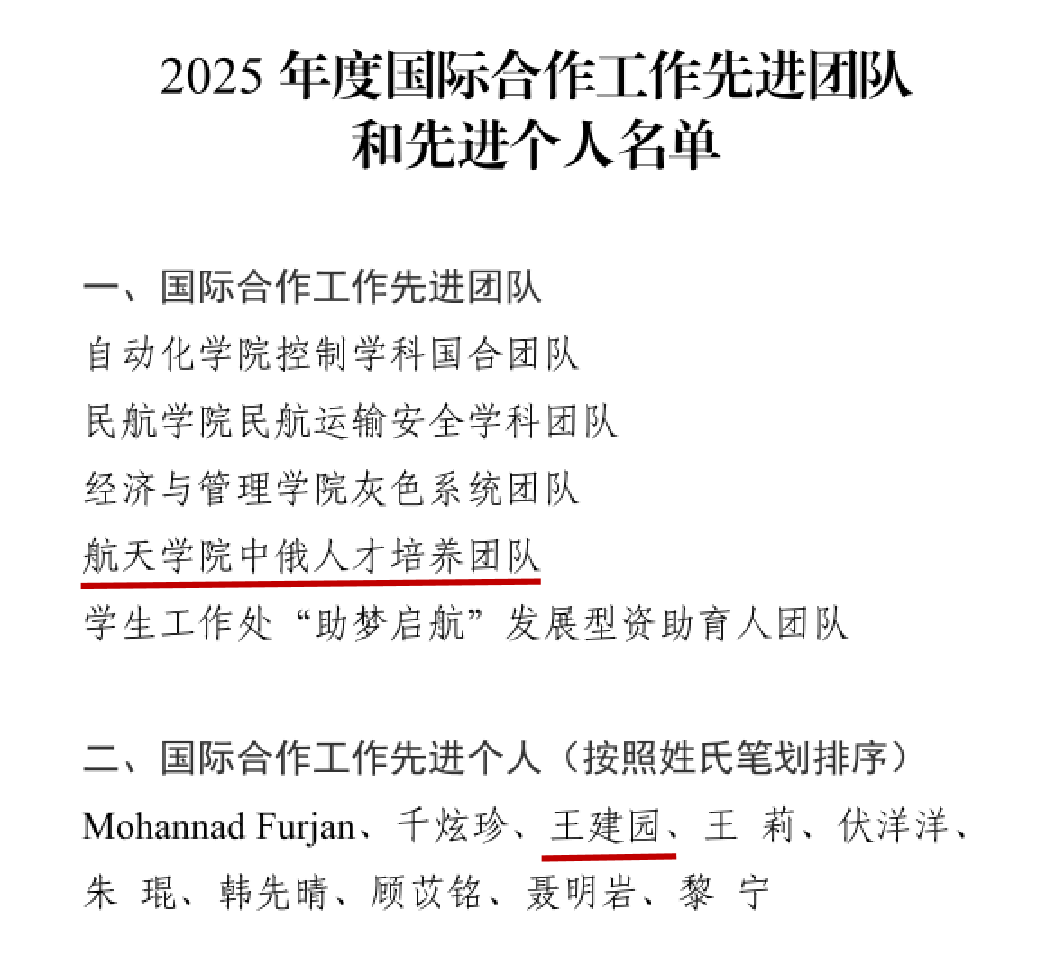 Betway·必威(西汉姆联)始终将国际化作为推动学院高质量发展、服务学校“双一流”建设的重要引擎,坚持主动谋划、精细落实,在打造国际化人才培养特色、推进教育部中外合作办学项目落地、深化与俄罗斯萨马拉国立研究大学及喀山图波列夫国家研究型技术大学合作等方面取得显著成效。2025年,学院成功获批国家留学基金委促进与俄乌白国际合作培养项目1项, 与俄罗斯喀山图波列夫国家研究型技术大学合作举办的“飞行器控制与信息工程”专业本科教育项目获批教育部中外合作办学项目。此外,王建园老师在中外合作办学项目推进、中俄班日常管理、协助引进俄罗斯高层次人才等方面表现突出,作出了积极贡献。